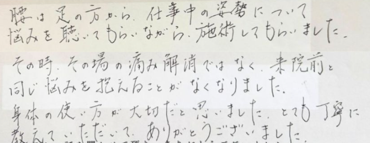 初回、2回目の状態に合わせてセルフケアの内容を指導してもらい、仕事中にもできるものを教えてもらったので、仕事中だいぶ楽に動けてます。