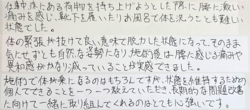 初回時点で腰に痛みがなくなり、2回目の施術まで痛みも出ませんでした。