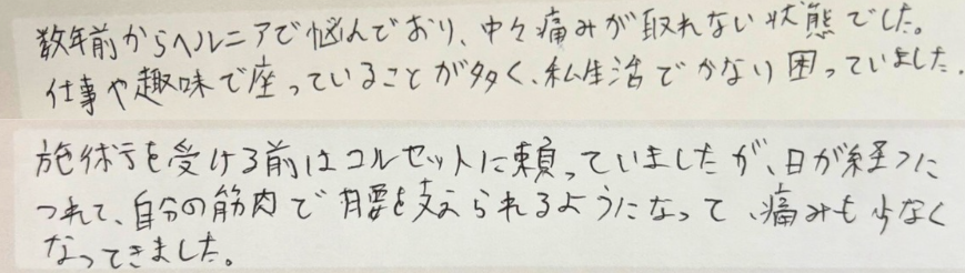 痛みがリハビリをしたり、痛み止めを飲んでいても、コルセットが手放せず、電車での出退勤や仕事で長時間座っていられない状態でした。